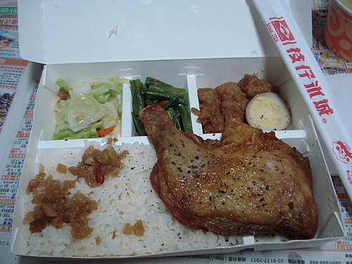 看起來不起眼的雞腿便當,雞腿肉吃起來鮮嫩多汁,又不會炸太老~